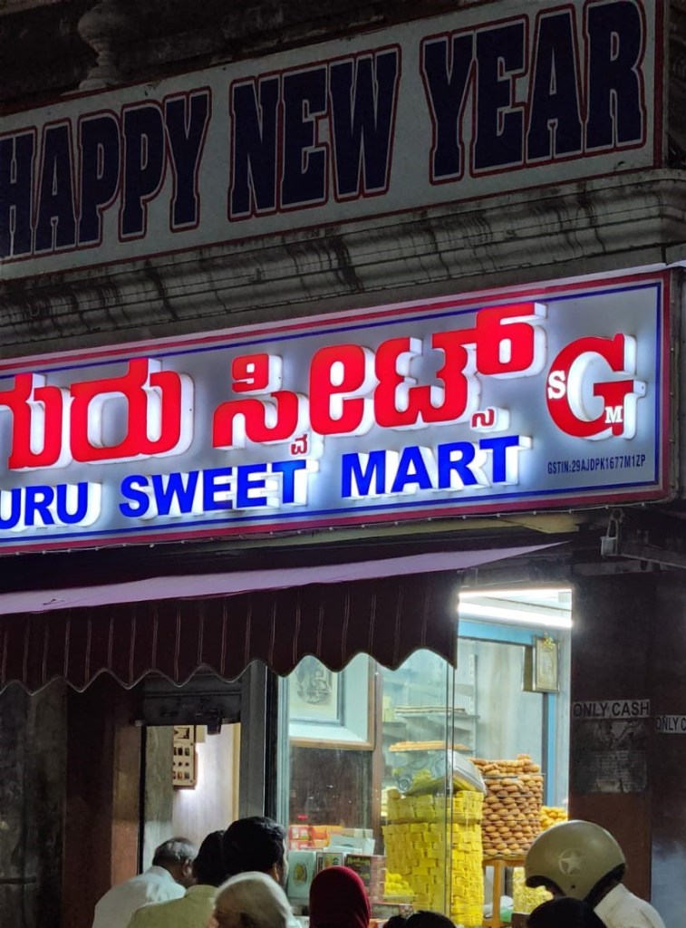 Guru Sweet Mart is nothing like I have ever seen. It is a tiny shop that fashions only windows. Through the window, you can marvel at the treasury of sweets that they make – Myriad Mysore Paks, Jalebis, Savouries and what not!